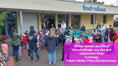 Kinder denken ans Klima“ – dieser Aussage wollten die angehenden Schulkinder der drei städtischen Kitas von der Hütte lautstark Ausdruck verleihen. Am 16.09.22 kamen so mehr als 60 Kinder mit ihren Erzieherinnen zusammen um gemeinsam auf die Bedeutung des Klimawandels aufmerksam zu machen. Als Treffpunkt wurde der Platz vor dem Stadtteilhaus gewählt. So wurde eine Öffentlichkeit hergestellt und auch direkt genutzt. Zwei Tagespflegepersonen schlossen sich spontan mit ihren Kindern der Aktion an. Die Vorschulkinder hatten sich in den Kitas vorbereitet und aus bereits gebrauchten Materialen verschiedenste Rhythmusinstrumente gebastelt. Anhand dieser Upcyclingaktion konnten das Oberthema „Klima“ schon in den Einrichtungen thematisiert werden. Natürlich war auch den Kindern nicht entgangen, dass es seit Wochen nicht geregnet hatte. So wurden Lieder zum Thema Regen präsentiert und die Auswahl zeigte dann auch im Laufe des Tages ja noch reichlich Wirkung! ;-)