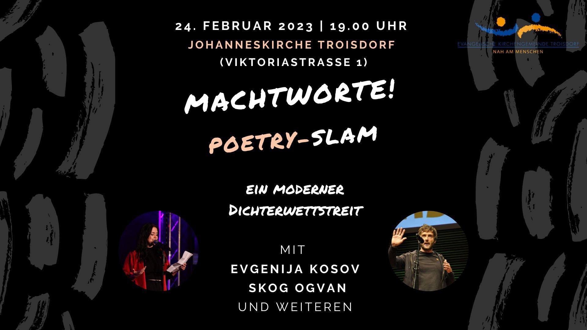 Am 24. Februar findet wieder ein Poetry-Slam in der Johanneskirche statt. Unter dem Titel „Machtworte – Menschen des Wortes suchen das Wortgefecht“ treten verschiedene junge Poeten mit ihren selbstverfassten Texten auf, um das Publikum mit nachdenklichen und kreativen Wortbeiträgen zu unterhalten. Die großen und kleinen Fragen des Lebens werden in Vorträgen – mal lustig, mal ernster – erörtert, über die dann jeweils das gesamte Publikum abstimmen darf. Unter anderem sind als Slam Poeten dabei Evgenija Kosov und Skog Ogvann, die schon seit vielen Jahren in der Slam-Szene unterwegs sind und sich dort einen Namen gemacht haben.