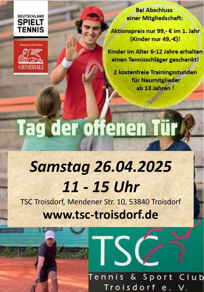Der Tennis & Sport Club Troisdorf e.V. lädt herzlich zum Tag der offenen Tür ein. Interessierte können den Verein kennenlernen und sich über attraktive Mitgliedschaftsangebote informieren.