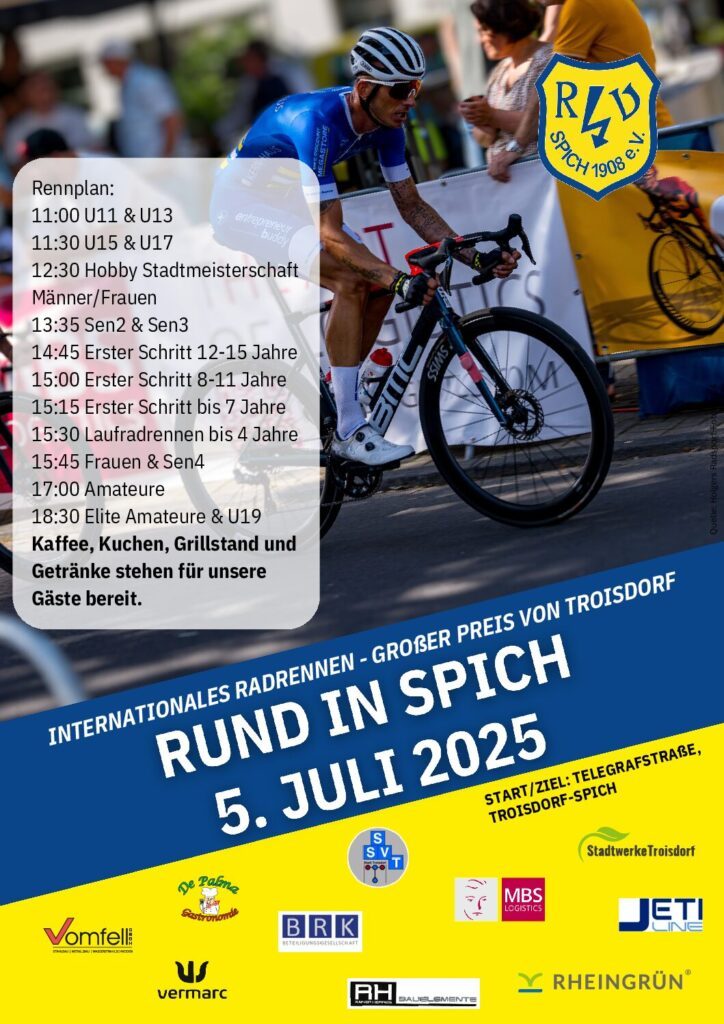 Am 5. Juli findet in Troisdorf-Spich das internationale Radrennen „Rund in Spich“ statt. Die traditionsreiche Veranstaltung bietet ein spannendes Programm für Radsportbegeisterte und Familien. Von den jüngsten Teilnehmerinnen und Teilnehmern bis zu den Elitefahrern sind alle Altersklassen vertreten.