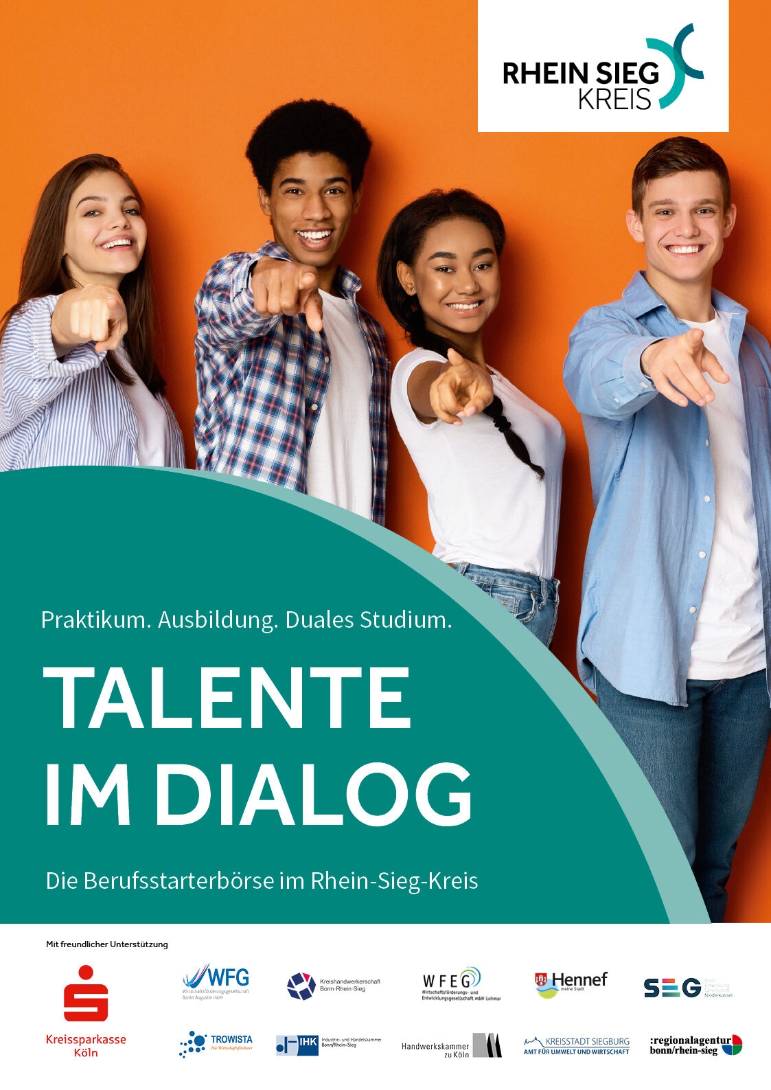 Praktikumsplätze, zukunftssichere Ausbildungsplätze, duales Studium und interessante berufliche Perspektiven – das alles bietet „Talente im Dialog“, die Berufsstarterbörse im Rhein-Sieg-Kreis. Hier treffen Schülerinnen und Schüler die Personalverantwortlichen von Unternehmen und Institutionen aus der Region.