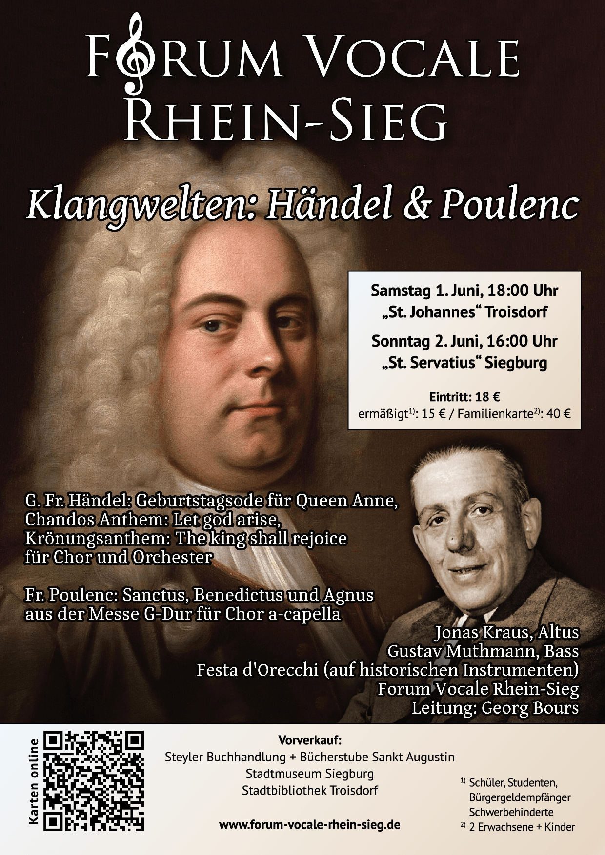 Unter dem Titel „Klangwelten“ bietet der Kammerchor „Forum vocale Rhein-Sieg“ mit Musikern des Bonner Barockorchesters „Festa d‘Orecchi“ eine Klangreise für die Ohren an: Unter der Leitung von Georg Bours erklingen selten aufgeführte Huldigungs- und Fest-Kantaten G. F. Händels für den englischen Hoch- und Höchst-Adel. In ihnen reicht das Klangspektrum von kammermusikalischen Vokal- und Instrumental-Soli über Duette, Chor-Refrains und -Fugen bis zur lärmenden Pracht der Krönungshymnen für Georg II. Stärksten Kontrast dazu bilden Sätze aus Francois Poulencs a-cappella-„Messe en Sol“ von 1937: Zarteste quasi gregorianische Cantilenen und ein kompakter Chorsatz von mystisch-innigen bis zu expressionistisch entfesselten Klangereignissen wechseln einander ab.