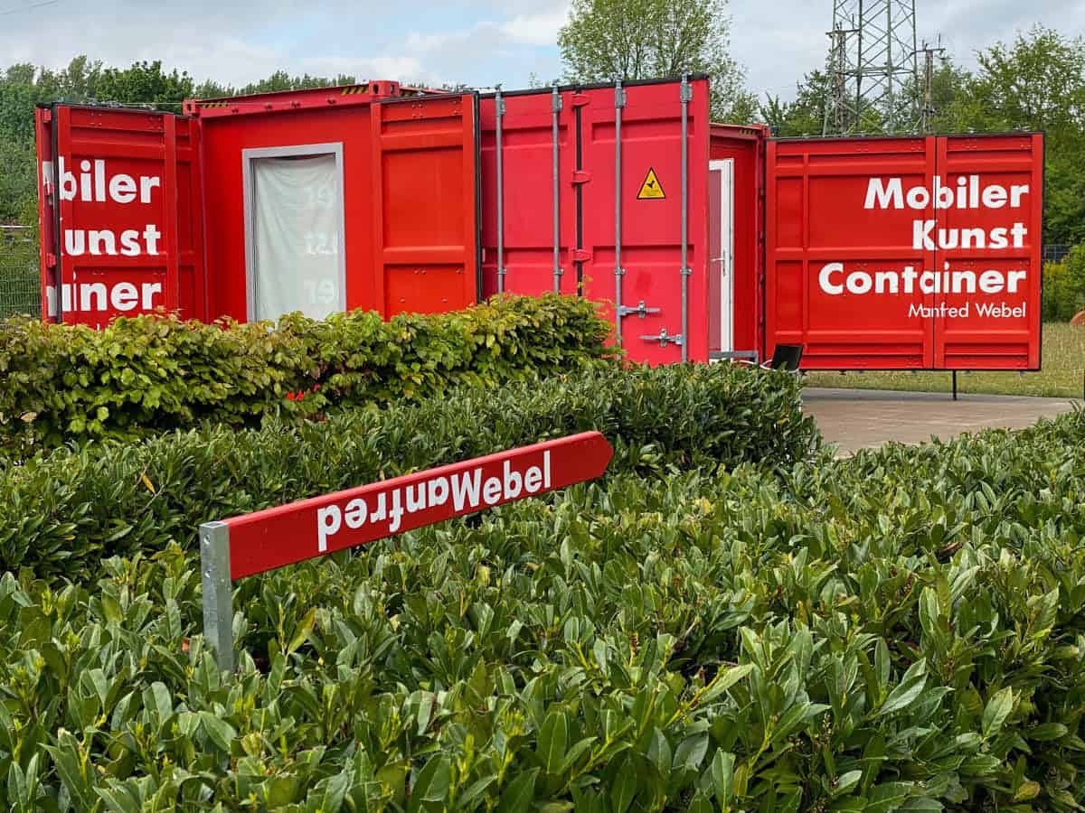 Ort: Roter Kunstcontainer vor der Burg Wissem