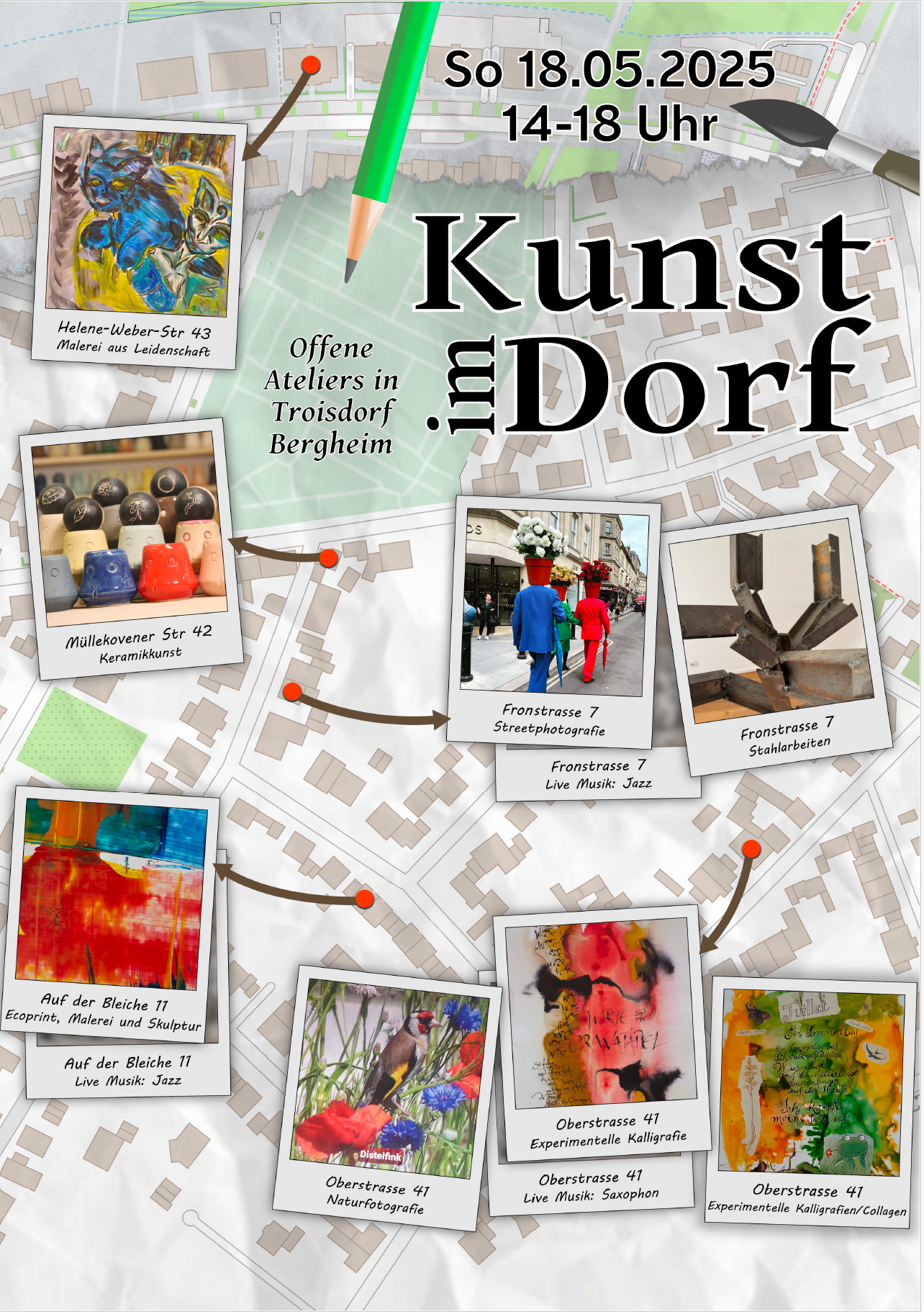 In Troisdorf-Bergheim öffnen am 18. Mai, von 14 bis 18 Uhr, acht Künstler an fünf Orten ihre Ateliers und zeigen viele verschiedene Kunstrichtungen.