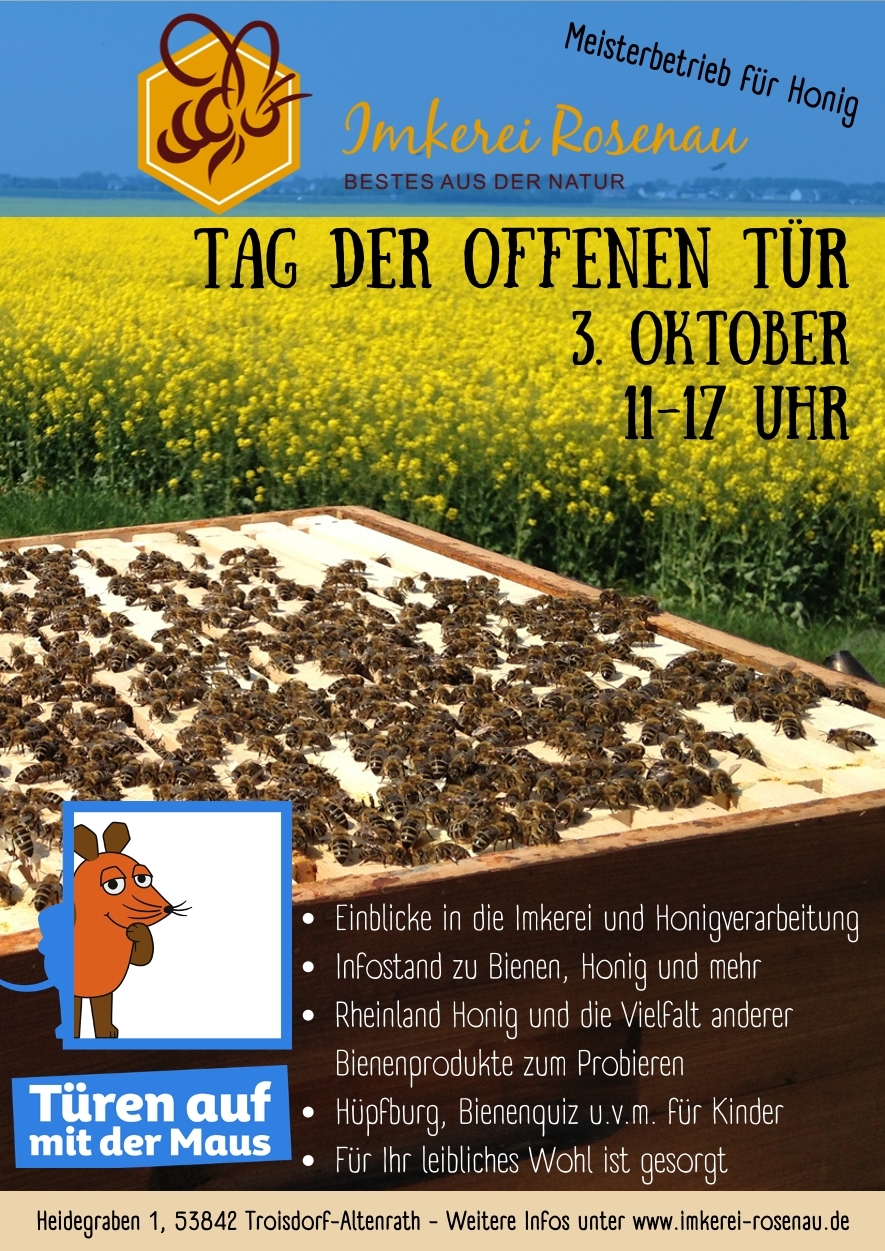 Am 3. Oktober findet von 11 bis 17 Uhr der bundesweite #Maustüröffnertag mit der Maus vom WDR in der Imkerei Rosenau statt. Besucherinnen und Besucher erhalten spannende Einblicke in die Entstehung, Ernte und Verarbeitung von Bienenwachs und Honig. Die Welt der Bienen wird anschaulich vorgestellt – von der Honigwabe bis zum fertigen Glas regionalen Honigs.
