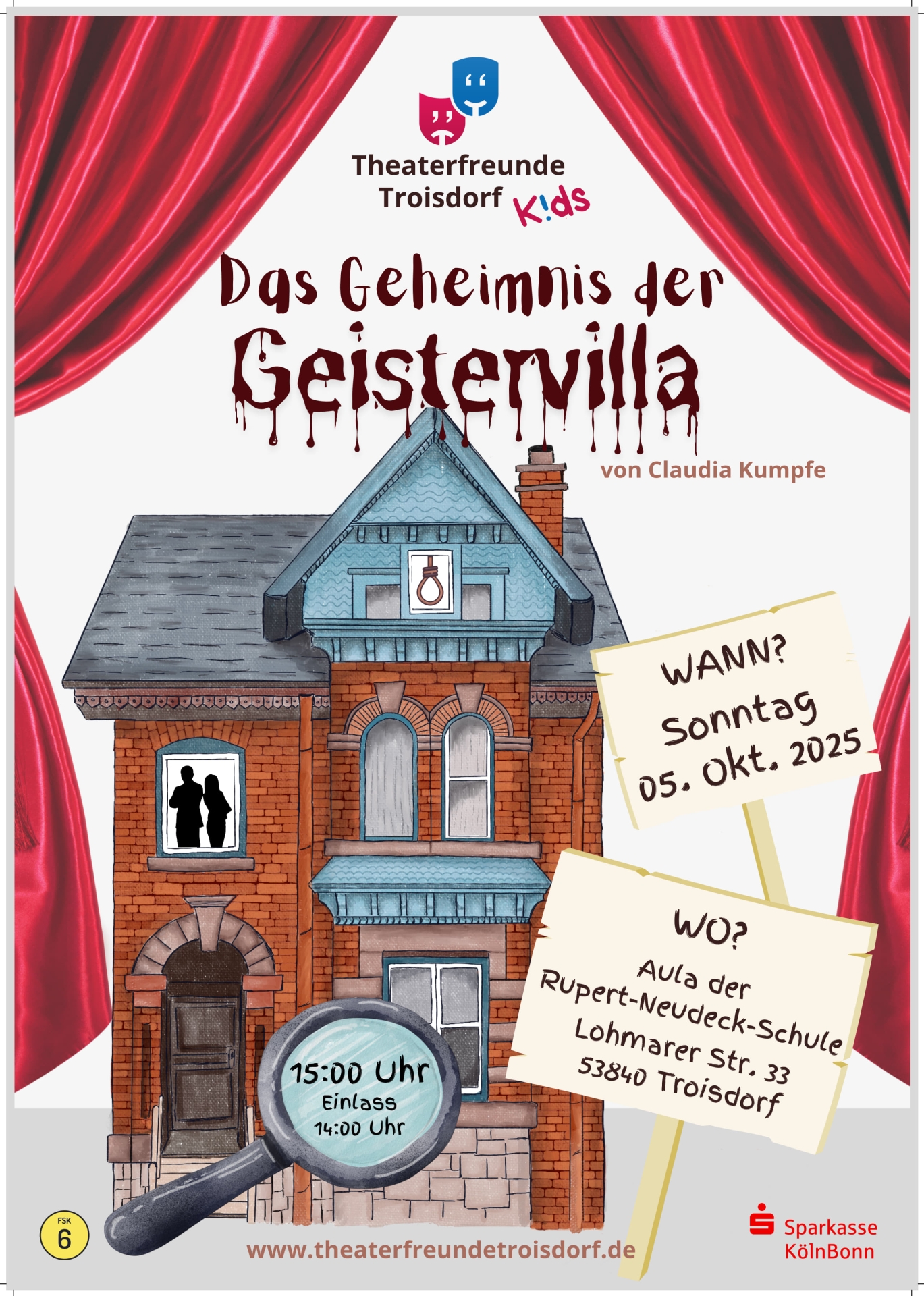 Ein geheimnisvolles Haus, schaurige Schatten und ein spannendes Abenteuer: Die Theaterfreunde Troisdorf Kids präsentieren ein mitreißendes Theaterstück für die ganze Familie. Das Geheimnis der Geistervilla lädt ein zu einer aufregenden Reise voller Rätsel, Mut und Teamgeist. Ein unterhaltsames Erlebnis für Kinder ab 6 Jahren und alle Junggebliebenen.