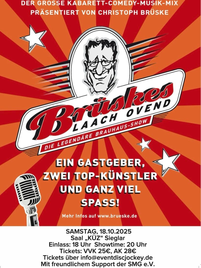 Am Samstag, den 18. Oktober, gibt die erfolgreichste Comedy Show des Rhein-Sieg Kreises ein Gastspiel im Festsaal „Zur KÜZ“. Dann kommt „Brüskes Laach Ovend“ nach Sieglar.