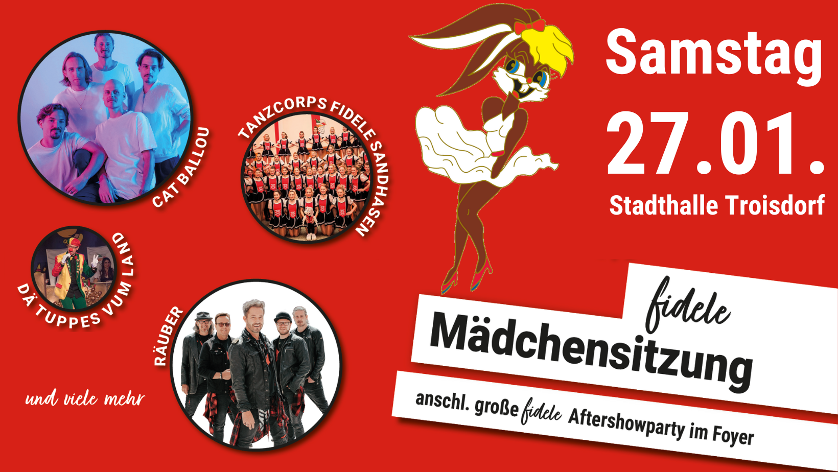 In diesem Jahr mit dabei: Cat Ballou | Drummerholics | Räuber | Stadtrand | Achnes Kasulke | Dä Tuppes vum Land | Tanzgruppe Rezag Husaren | Tanzcorps "Fidele Sandhasen"