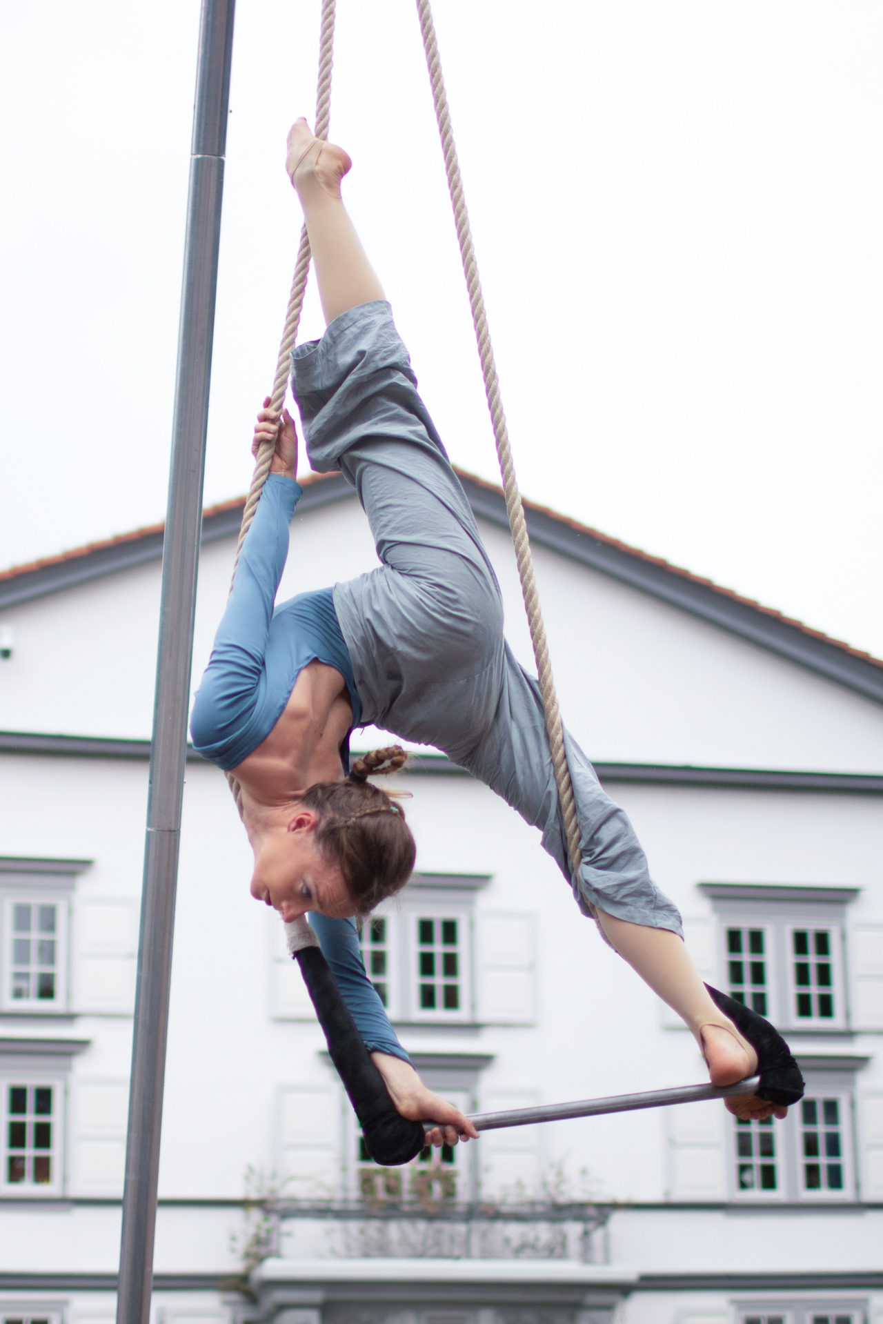 Wie finden wir Leichtigkeit, wenn das Leben uns immer wieder aus der Balance bringt? In der 30- minütigen Soloperformance „Threading Lightness“ begibt sich Marie auf die Suche nach einem Weg aus dem selbst geschaffenen Chaos. Ihr einziges Requisit: das Trapez, das mal als Spielpartner am Boden, mal in der Luft zum Sinnbild für Kontrolle und Loslassen wird. In einem ständigen Wechsel zwischen Herausforderung und Entfaltung zeigt das Stück, wie der Versuch, alles zu kontrollieren, oft das Gegenteil bewirkt –und wie viel Kraft in der Fähigkeit liegt, innezuhalten. Schritt für Schritt entdeckt sie die Leichtigkeit, die sie auch am Trapez immer höher steigen lässt.
