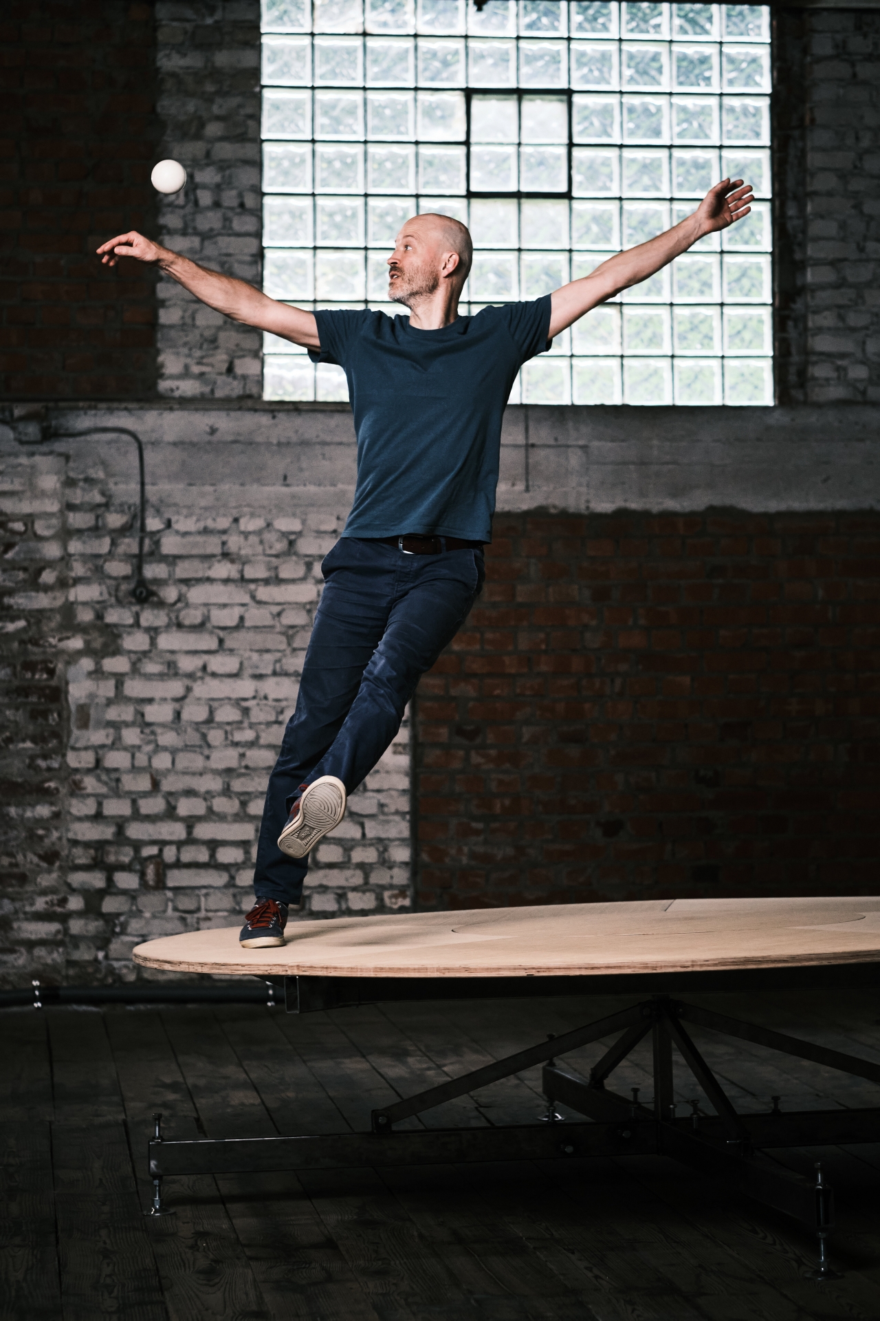Roundabout ist ein skurril-poetisches Spiel zwischen einem Jongleur und einer 2,5 m großen, drehbaren Scheibe.
