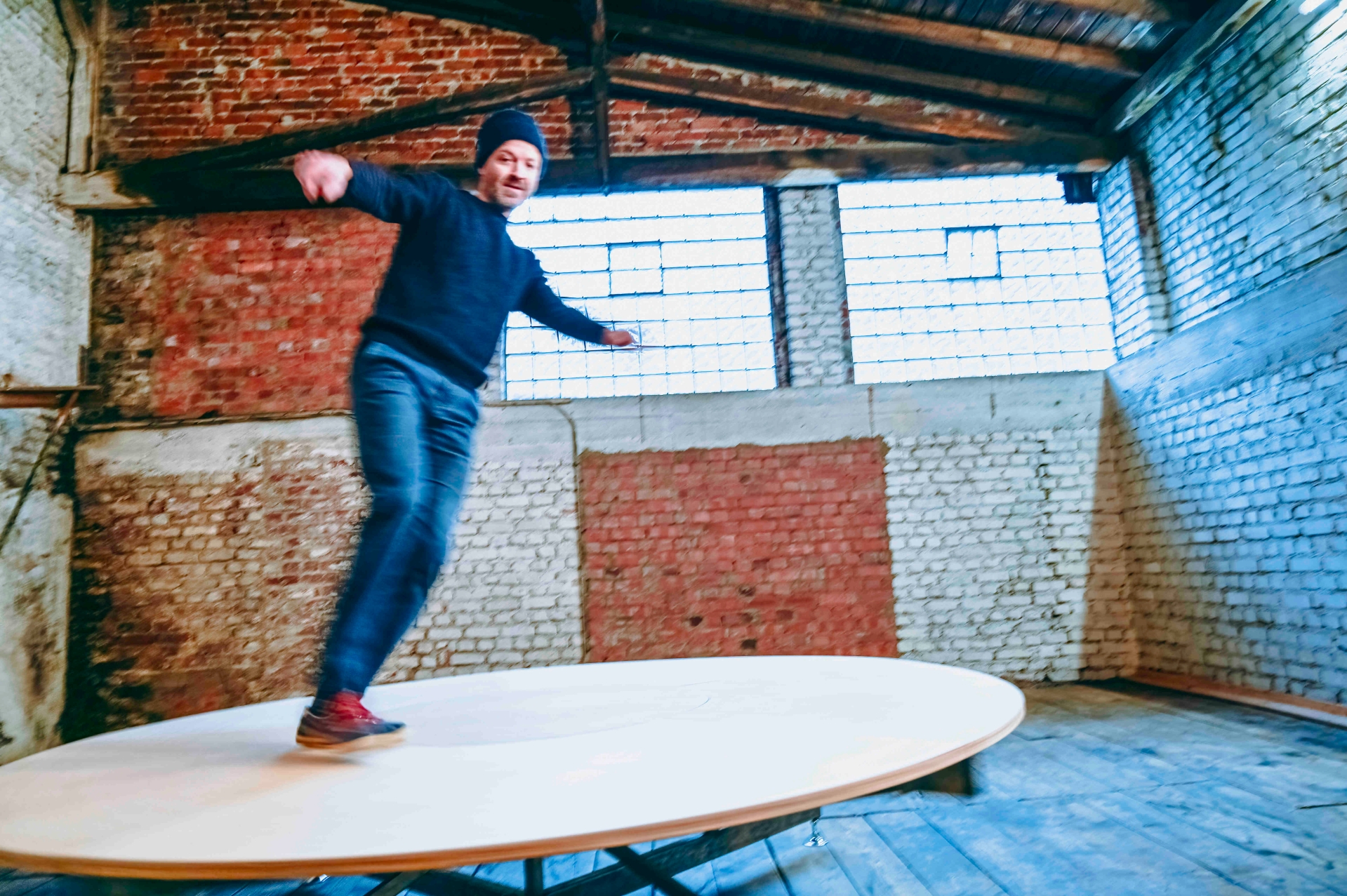 Es ist ein zirzensisches Experiment, bei dem eine schwindelerregende Welt mit ganz eigenen, absurden Gesetzen entsteht. Die Drehscheibe wird zum horizontalen Hamsterrad, das geduldig am Laufen gehalten wird.