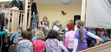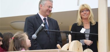 Bürgermeister Klaus-Werner Jablonski und Kita-Leiterin Doris Hahner bestiegen die Kommandobrücke eines großen Holz-Kletterschiffes im Foyer der Kita und eröffneten gemeinsam offiziell die neue städtische Einrichtung. Die Kinder, Eltern und Erzieherinnen, zahlreiche Gäste und der Architekt Ludwig Konrath wohnten der Einweihung bei und freuten sich über die hellen Räume und die geschmack- und anspruchsvolle Einrichtung der modernen Kindertagesstätte.