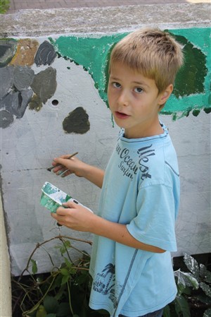 Jetzt wagte er sich mit 13 Kindern in und an den Urwald entlang der Mauer op de Hött. Es war eine Malaktion im Rahmen des kurzweiligen Ferienprogramms des Stadtteilhauses an der Lahnstraße, einer Einrichtung des Troisdorfer Jugendamts.