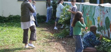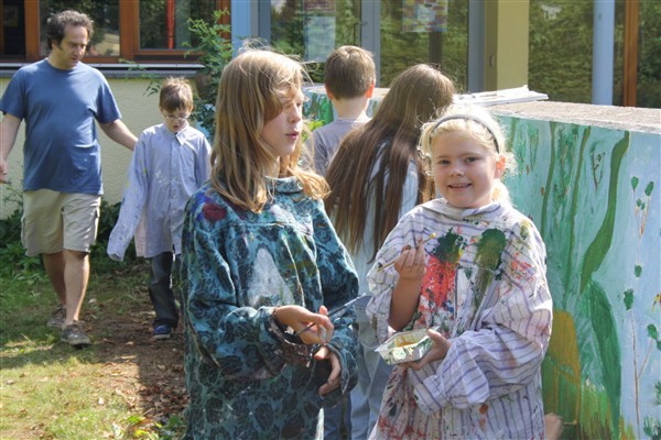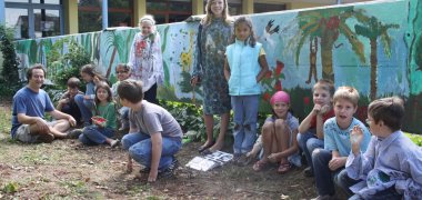 Exotisch anmutende Tiere und Pflanzen wie im Dschungel, dazu ein Malwetter fast wie in den Tropen: Troisdorfer Kinder entwarfen malerisch eine farbenfrohe Landschaft an der Mauer des Stadtteilhauses in Troisdorf-Friedrich-Wilhelms-Hütte. Der Kölner Künstler Kazem Heydari half den jungen Malerinnen und Malern, die zuvor graue unansehnliche Mauer kunterbunt und urwaldmäßig mit vielen überraschenden Details umzugestalten.