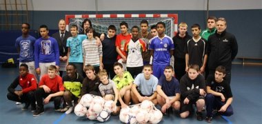 Aber nicht nur Geld, sondern auch personelle Unterstützung gewann die Troisdorfer Schule: Die beiden Ex-Bundesliga-Spieler Marcel Witeczek (früher unter anderem beim FC Bayern München und Borussia Mönchengladbach) und Michael Klinkert (früher Abwehrspieler bei Schalke 04 und ebenfalls Borussia Mönchengladbach) trainierten 22 Schüler in der Rundsporthalle am Elsenplatz. Training mit Profis und hinterher eine Gesprächsrunde – die Schüler und Schulleiter Peter Martin waren begeistert.