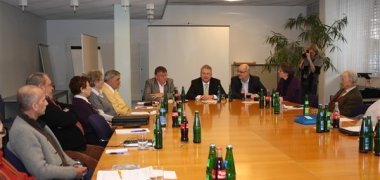 Am "runden Tisch": links Joachim Haas, rechts Paul Brachthäuser, Mitte v.l. Werner Zander, Bürgermeister Jablonski und Sozialamtsleiter Rolf Bertsche.