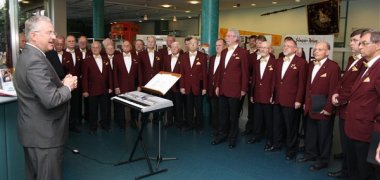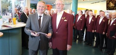 Mit zahlreichen Veranstaltungen feiert der Troisdorfer Männerchor in diesem Jahr stolz und sangesfreudig sein 100jähriges Bestehen. Dazu gehört auch eine Ausstellung im ARThaus RAThaus mit Fotos, Berichten, Plakaten, Notensammlungen und der beeindruckenden historischen Chorfahne. Bürgermeister Klaus-Werner Jablonski und der Vorsitzende des Troisdorfer Männerchors, Horst Gehlen, eröffneten die Ausstellung im Rathaus. Zur Eröffnung gehörten natürlich auch Lieder, die der gesamte Chor stimmgewaltig vortrug. Fünfundfünfzig Männer gaben dem Bürgermeister schwungvoll ein Ständchen. Der war sichtlich gerührt und nahm die Festschrift zum Jubeljahr entgegen.