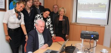 Zur ersten Präsentation der Seite schauten Vertreter der Sponsoren dem versierten PC-Experten Peter Hellwege gebannt über die Schulter und auf die Tastatur: Jürgen Weller, Vorsitzender der AWO Mitte, von der VR Bank Rhein-Sieg Regionaldirektorin Meggi Engels und Geschäftsstellenleiterin Regine Eveleens, der Leiter des städtischen Sozial- und Wohnungsamtes, Rolf Bertsche, seine Mitarbeiterin und Geschäftsführerin der Stiftung Altenhilfe, Claudia Grunenberg, sowie Annette Grötschla von der Firma Rahm.