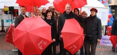 Zwar regnete es am Internationalen Tag gegen Gewalt an Frauen nicht, aber trotzdem spannten Frauen in der Troisdorfer Fußgängerzone rote Schirme auf unter dem Motto „Wir lassen Frauen nicht im Regen stehen“. Gemeinsam verdeutlichten die Gleichstellungsbeauftragten der Kommunen, Mitarbeiterinnen der Frauenhäuser und weitere Mitglieder des „Runden Tisches gegen häusliche Gewalt“ ihren Willen, Gewaltopfern schnell und unbürokratisch zu helfen.