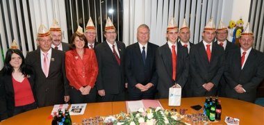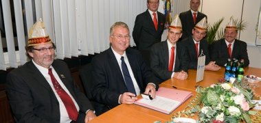 Damit wurde es quasi amtlich: Bürgermeister Klaus-Werner Jablonski begrüßte die zukünftigen närrischen Herrscher über die Troisdorfer Altstadt in der Session 2010/2011 im Rathaus. Das Dreigestirn der Friedrich-Wilhelms-Hütte unterschrieb im Beisein des Stadtoberhaupts eine Vereinbarung mit dem Festausschuss Troisdorfer Karneval unter Vorsitz von Hans Dahl. Demnach sollen Prinz Jörg I. (Kaiser), Bauer Fred (Brodesser) und Jungfrau Agnetha (Sascha Jablonski) im Januar 2011 auch als Troisdorfer Dreigestirn für Troisdorf-Mitte - der sogenannten Altstadt - inthronisiert werden.