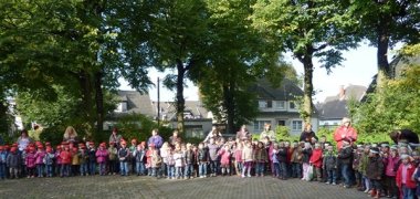Bereits rheinische Tradition, weil sie zum dritten Mal stattfand, ist die Aktion „Hütte singt“. Die Kinder aus den vier Kindertageseinrichtungen des Stadtteils Friedrich-Wilhelms-Hütte kamen frohgemut zusammen, um gemeinsam Lieder passend zur Jahreszeit zu singen. Nach den bisherigen Treffen im Stadtteilpark und an der Kita Curieweg, trafen sich diesmal rund 200 Kinder mit ihren Erzieherinnen und interessierten Eltern auf dem Windgassenplatz in der „Schwarzen Kolonie“.