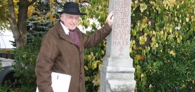 Geschichte und Geschichten: Kurt P Schneider in Aktion vor dem Präsenzkreuz an der Ecke Spicher Straße und Larstraße.