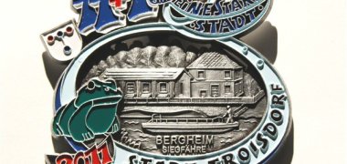 Unter dem Leitgedanken mit frappierend närrischem Zahlenspiel „11+1 Stadtteile – eine starke Stadt“ wird in diesem Jahr die alphabetische Ordenserie rund um die 12 Stadtteile fortgesetzt, die im letzten Jahr mit Altenrath begonnen hatte. Diesmal trifft es Troisdorf-Bergheim, abgebildet sind die Siegfähre und ein Frosch, quasi das Wappentier der Bergheimer. Die Eschmarer freuen sich schon auf den metallenen farbenfrohen Karnevalsorden im kommenden Jahr.