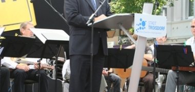 Bei strahlendem Sonnenschein begrüßte Bürgermeister Klaus-Werner Jablonski im Rahmen des diesjährigen Troisdorfer Familienfests in der City unter einem Riesenschirm an der Kölner Straße, Ecke Von-Loe-Straße, rund 350 neue Troisdorfer Einwohnerinnen und Einwohner. Der „Neubürger-Empfang“ findet schon zum vierten Mal statt und stieß wie in den Vorjahren auf große Resonanz bei den zugezogenen Familien und Einzelpersonen. Das liegt nicht nur daran, dass der Bürgermeister die Bürgerinnen und Bürger in ihrer neuen Heimat persönlich willkommen heißt und zu einem kleinen Imbiss einlädt. Obendrein begann nach der Rede des Stadtoberhaupts das Programm „InKultur“ mit abwechslungsreichen Darbietungen einiger Troisdorfer Kulturvereine.