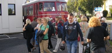 Mit 70 Teilnehmern rappelvoll war die Fahrt mit dem sogenannten Rhabarberschlitten von Troisdorf nach Lülsdorf und zurück mit Besuch einer Ausstellung der Rhein-Sieg-Verkehrsgesellschaft RSVG. Die zweistündige Exkursion leiteten Heimathistoriker Kurt P. Schneider und Clemens Overath von der RSVG.