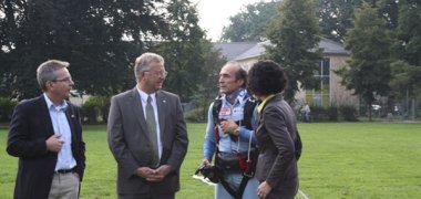 Mit einem Highlight begann die diesjährige Troisdorfer Sportlerehrung. Vor der Burg Wissem landete der bekannte frühere Reck-Weltmeister und jetzige Bundestagsabgeordnete Eberhard Gienger mit seinem Fallschirm aus 1000 Metern Höhe und wurde dort von seiner Bundestagsabgeordneten-Kollegin Lisa Winkelmeier-Becker und Bürgermeister Klaus-Werner Jablonski begrüßt. Mit Oldtimern ging es in der Fußgängerzone zur Sportarena, wo weitere prominente Sportler von Moderator Thomas Kalus interviewt wurden.