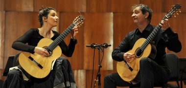 Originell und virtuos: Eigenkompositionen im Stil von Folk und Jazz spielt das Levante Guitar Duo, das sind die Gitarristen Aleksandra Lazarevic und Vojislav Ivanovic. Das Konzert mit flottem Jazz des Belgrader Duos beginnt