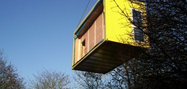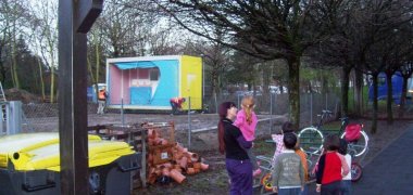 „Kommt eine Kita geflogen…!“ sangen lauthals die Kinder der städtischen Kindertagesstätte Julius-Leber-Straße, fasziniert von einem großen Kranwagen, der mehrere knallgelbe Container auf das Kita-Gelände schweben ließ. Der damit geschaffene zusätzliche Raum dient der Erweiterung der Kita um eine U-3-Gruppe (unter 3 Jahre alt) mit 10 Kindern. Der rund 200 qm große Containerkomplex kostet 250.000 Euro, zusätzlich gibt die Stadt 70.000 Euro für Außengestaltung und Nebenkosten aus.