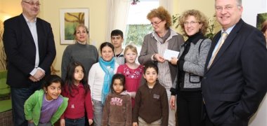 Große Freude gab es im Mehrgenerationenhaus in Troisdorf-Friedrich-Wilhelms-Hütte: Claudia Siegmund, Geschäftsführerin des Troisdorfer Familienunternehmens Bäcker Eich, überreichte im Beisein von Bürgermeister Klaus-Werner Jablonski, Sozialamtsleiter Rolf Bertsche und zahlreicher Kinder der Leiterin der Einrichtung, Claudia Hoffmann, eine großzügige Spende: Ein Erlös von 750 Euro war beim Verkauf des Jubiläumsbrotes zum 75-jährigen Bestehen der Bäckerei zusammengekommen, der nun der sozialen Einrichtung zur Verfügung stehen wird.