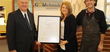 Bürgermeister Klaus-Werner Jablonski war einer der ersten Gratulanten im Geschäft Zur Goldschmiede Günther, Kölner Straße 106: Das Ehepaar Jutta und Jörg Günther waren vom Düsseldorfer Fachverlag „markt intern“ zum „1a-Fachhandwerker“ ausgezeichnet worden. Basis dafür sind neben handwerklichem Können und angemessenen Preisen auch ein außergewöhnlicher Service, gute Beratung und Kundenfreundlichkeit.