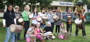 Laut und ungestüm, aber rhythmisch ging es drei Tage lang im Stadtteilhaus in Troisdorf-Friedrich-Wilhelms-Hütte zu. Vierzehn Kinder im Alter zwischen 6 und 12 Jahren trommelten kräftig und tanzten und sangen dazu deutsche Kinderlieder, die unversehens afrikanisch klangen. Der Musiker Aidara Seck (29) aus dem Senegal brachte ihnen im Rahmen des Ferienprogramms im Stadtteilhaus das Trommeln bei.