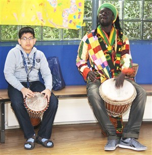Dabei wurde er durch Bambang Susiadi aus Indonesien trommelnd unterstützt, quasi als afrikanischer Basso continuo. „Die Kinder sind begeistert bei der Sache und haben schnell die afrikanischen Rhythmen gefunden. Beim Trommeln, Tanzen und Singen können sie so richtig aus sich heraus gehen“, freute sich Seck. Er kommt aus einer musikalischen Familie, trommelt auf seiner „Jembe“, erzählte den Kindern packende Geschichten aus dem Senegal und brachte zum Abschluss der temperamentvollen Trommeltage leckeres süßes Couscous nach heimatlichem Rezept mit.