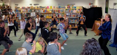 Im Anschluss an die Lesung konnten die Jungen und Mädchen in die Rollen der Kung-Fu-Kämpfer schlüpfen und selbst einige Übungen der fernöstlichen Kampfkunst absolvieren. Die Jugendlichen waren mit Eifer und Disziplin bei der Sache und auch der Spaß kam nicht zu kurz, wenn wieder einmal jemand bei einem „Kick“ das Gleichgewicht verlor.