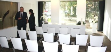 Die überaus einladend wirkenden Räume von Trauzimmer, Empfangsraum, Umtrunkraum (in Bälde auch mit Terrasse) und Toiletten umfassen 200 qm und damit viermal mehr Fläche als im vorherigen Trauzimmer in der Remise. Die Räume des Standesamts sind ein wichtiges Element im Gesamtprojekt Umbau der Burg Wissem. Wenn die Hochzeitspaare durch das historische Burgtor schreiten, betreten sie modernes Ambiente.