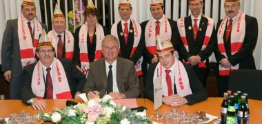 Damit wurde es quasi amtlich: Bürgermeister Klaus-Werner Jablonski begrüßte die zukünftigen närrischen Herrscher über die Troisdorfer Altstadt der Session 2011/2012 im Rathaus. Das designierte Dreigestirn unterschrieb im Beisein des Stadtoberhaupts eine Vereinbarung mit dem Festausschuss Troisdorfer Karneval unter Vorsitz von Hans Dahl. Demgemäß werden Prinz Michael I. (Marner), Bauer Dennis (Marner) und Jungfrau Christiane (Christian Beck) am 7. Januar 2012 als Troisdorfer Dreigestirn für Troisdorf-Mitte - der sogenannten Altstadt - proklamiert werden.