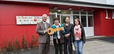 Insgesamt hat die Stadt Troisdorf 800.000 Euro in die Komplettsanierung investiert. Im Rahmen eines Pressetermins übergab Bürgermeister Klaus-Werner Jablonski der Schule mit Schulleiterin Dagmar Kern, Schülern, Freunden und Förderern symbolisch einen Schlüssel für die neue Halle.