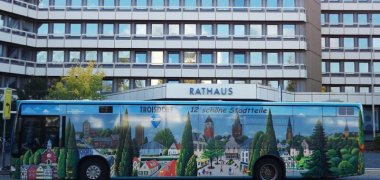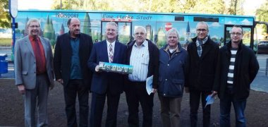 „Das ist nicht nur Werbung für unsere starke lebendige Stadt mit ihren einzelnen Elementen, sondern auch für den öffentlichen Nahverkehr“, freute sich Bürgermeister Klaus-Werner Jablonski, als der Bus vor dem Rathaus hielt. Mit dabei waren der Künstler Josef Hawle sowie die Ortsvorsteher Achim Tüttenberg MdL (Altenrath), Klaus Schlicht (Eschmar), André Kern (Kriegsdorf), Alfons Bogolowski (Rotter See) und Rudolf Eich (West).