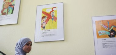 Schülerin Sakina zum Beispiel stellt in ihrer Zeichnung eine klassische Mobbing-Situation unter Schülern dar und wirbt für mehr Rücksicht untereinander. Sefa thematisierte das Handy-Verbot in der Schule, Jacqueline die mutwillige Zerstörung von Schulmöbeln. Natürlich geht es nicht zuletzt um Toleranz und Offenheit, auch Schülerinnen mit Kopftuch gegenüber. Laut Schulleiter Martin haben 70 Prozent der 352 Schülerinnen und Schüler Migrationshintergrund und davon sind 90 Prozent türkischer Abstammung. „Für die Schüler ist das ganz normal“, betont Lehrerin Schneider.