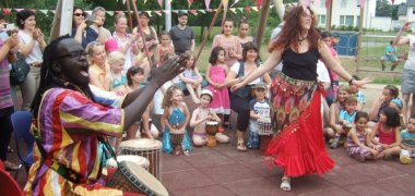 Der Höhepunkt war die Trommelsession mit dem senegalesischen Musiker Aidara Seck. Mit Herzblut und afrikanischem Rhythmus trommelte und sangen alle kleinen und großen Festbesucher. Herr Schröter vom mobilen Klettergarten Bonn lud die Kinder zum Klettern an der großen Eiche auf dem Außengelände ein, Herr Busch vom Allgemeinen Deutschen Fahrradclub ADFC baute und betreute einen ansprechenden und herausfordernden Fahrradparcours auf. Musikalisch verwöhnt wurden die Gäste während des Festes von der Band „SimonsaysDaniel“ mit beliebten Songs.