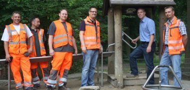 Sein Team bilden Thomas Höhner, Kai Friedrichs, Heiko Klein, Karl Küpper, Dennis Schloßmacher und Frank Schloemer. Sie führen einmal wöchentlich eine Sichtprüfung der Plätze durch, einmal im Monat eine Funktionsprüfung der Spielgeräte auf zehn Spielplätzen und dreimal wöchentlich Zusatzkontrollen auf vielbesuchten großen Plätzen. Im Sommer werden die Spielplätze am Haus Rott, Schellerod und Burg Wissem zusätzlich mehrmals gereinigt.