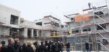 Im Schneegestöber mußte Polier Achim Schmidt seinen Richtspruch für das Haus Elisabeth, einer neuen Einrichtung in Troisdorf der Alexianer in Bonn/Rhein-Sieg, aufsagen, aber das Richtfest klappte reibungslos. Bürgermeister Klaus-Werner Jablonski gratulierte zum raschen Baufortschritt und den guten Perspektiven für die pflegerische Versorgung in unserer Stadt.