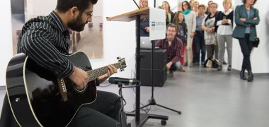 Für einen musikalischen Glanzpunkt der gelungenen Vernissage mit Motiven einer „Poesie des Absurden“ sorgte Siavosh Sadedin mit Eigenkompositionen an der Gitarre. Die Ausstellung „Masoud Sadedin – Die Schwelle“ ist bis zum 7. Dezember 2014 jeweils samstags von 15.00 bis 18.00 Uhr und sonntags von 11.00 bis 14.00 Uhr sowie nach telefonischer Vereinbarung unter Tel. 02241/1261581 zu sehen.
