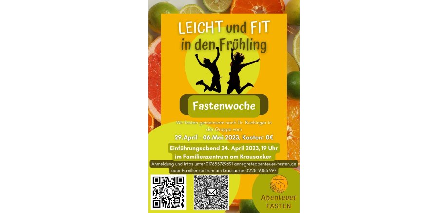 Die Kursgebühr übernimmt das Familienzentrum am Krausacker. Für Sie als Teilnehmende ist dieser Kurs gratis. Anmeldung im Familienzentrum Am Krausacker bei Saskia Ulrich unter Tel.: 0228-9086 997 oder per Email KG_AmKrausacker@troisdorf.de. Bei Fragen, ob eine Fastenwoche das Richtige für Sie ist, erreichen Sie die Fastenleiterin unter Tel./WhatsApp: 0176-5578 9691 oder annegret@abenteuer-fasten.de. Schnell sein lohnt sich. Es gibt nur 10 Teilnehmerplätze. Wir freuen uns auf Sie!