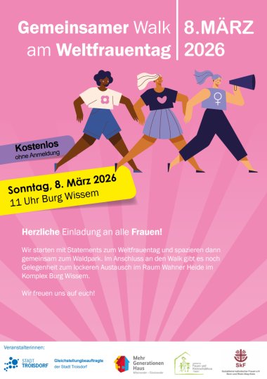 Am Sonntag, 8. März 2026, laden sie alle Frauen aus Troisdorf und Umgebung zu einem gemeinsamen Walk ein. Treffpunkt ist um 11 Uhr im Hof von Burg Wissem. Zum Auftakt gibt es Statements zum Weltfrauentag aus dem Kreis der Teilnehmerinnen.